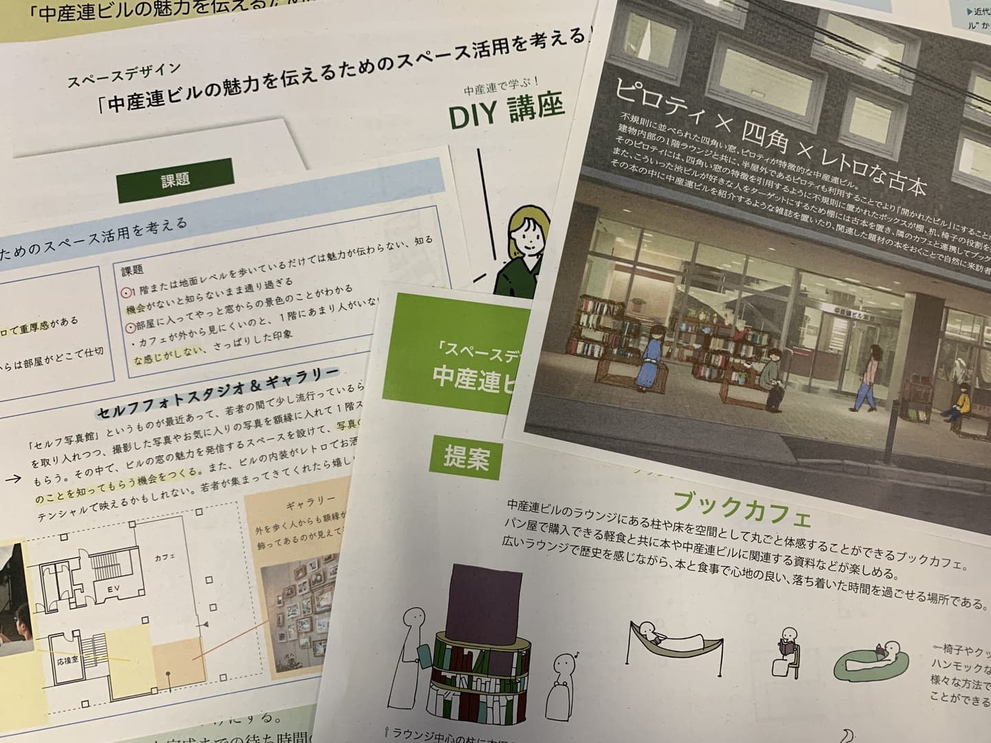 「近代建築から考える空間」をテーマに、「中産連ビルの管理について」「竣工から数十年経つ建築空間の扱い方」等の授業内容が進められ、設計者側からの視点で考える「中産連ビルの魅力を伝えるためのスペース活用」という課題に取り組んでくださいました。