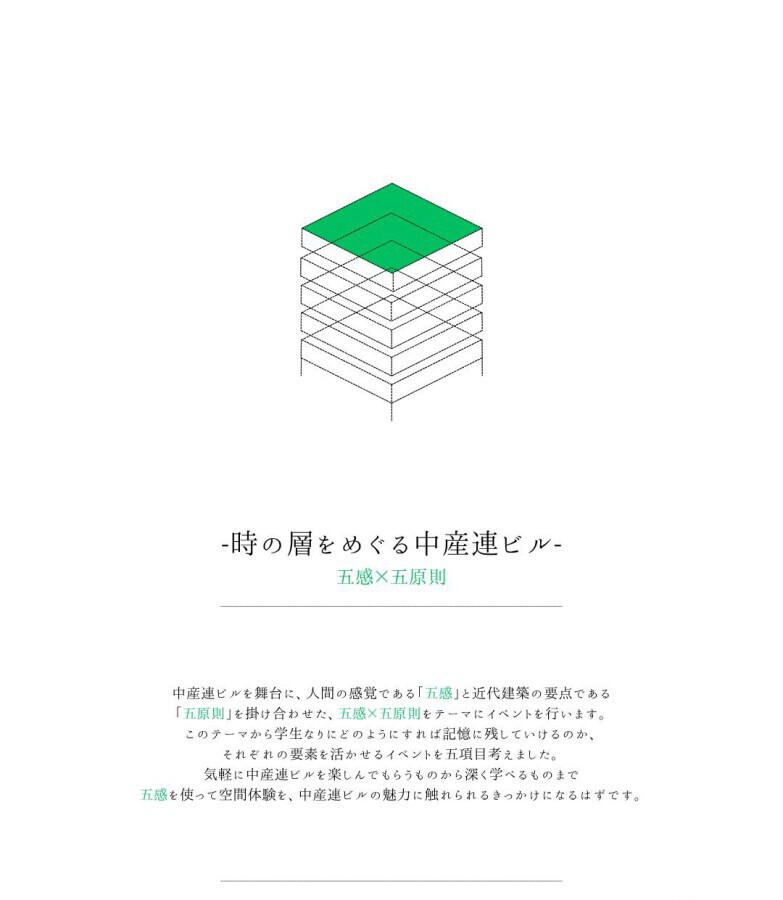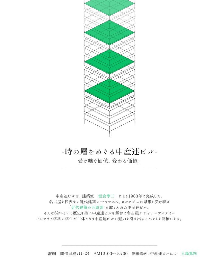 名古屋デザイナー・アカデミー インテリアデザイン学科の学生さんによるイベントに中産連ビルが全面協力する形で「時の層をめぐる中産連ビル」が行われました。なお、このイベントは授業として位置づけられており、企画・立案から始まり、調査・準備・イベントの当日運営までを学生さんが全て行っています。