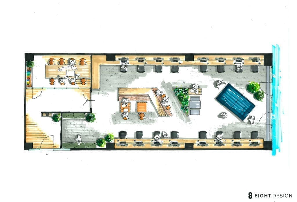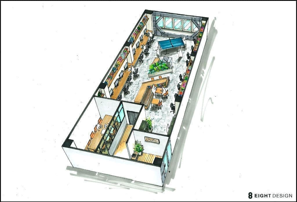 現状は、耐震補強の鉄骨や天井、壁、床のコンクリートもむきだしになっています。このスケルトン状態を活かしたプランです。セキュリティーを維持し、会議スペースを設け、仕事スペースは、自由な空間を演出しています。クリエイティブな事業者様に向けたレイアウトです。