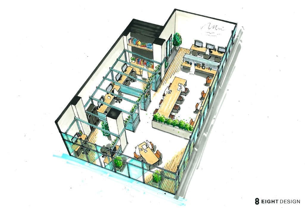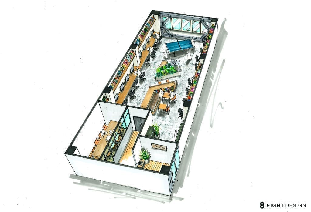 個の作業スペース、打ち合わせスペース、来客スペースをバランス良くレイアウトしたプランです。全体としてオープンスペースとなっており、開放感を感じられるプランとなっています。オフィススペースに隣接する倉庫スペースはアイデア次第で様々な可能性が広がります。